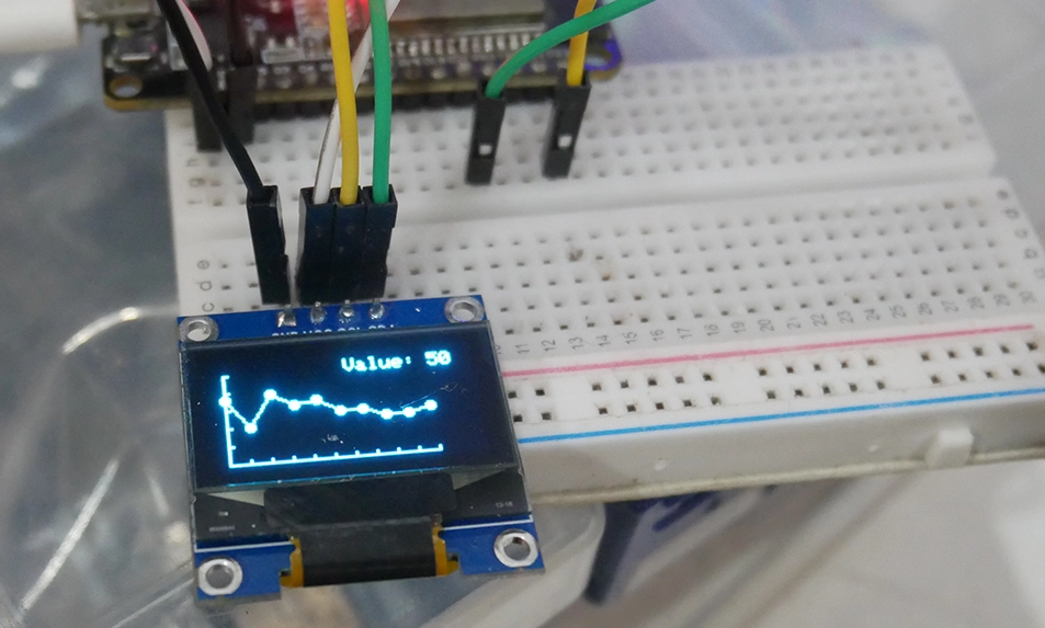 drawGraph()ถูกออกแบบมาเพื่อวาดกราฟบนจอ OLED โดยเริ่มจากการวาดแกน X และ Y ตามด้วยการวาดสเกลบนทั้งสองแกน และจุดข้อมูลจะถูกเชื่อมต่อด้วยเส้นกราฟ โดยใช้fillCircle()และdrawLine()จากไลบรารีAdafruit_GFX - ข้อมูลใหม่ที่เพิ่มเข้ามาในอาร์เรย์จะทำให้กราฟอัปเดตทุกๆ 2 วินาที