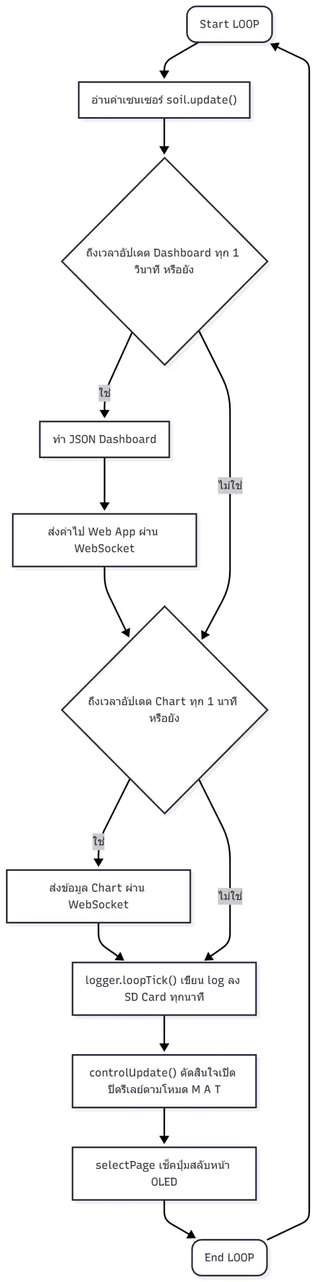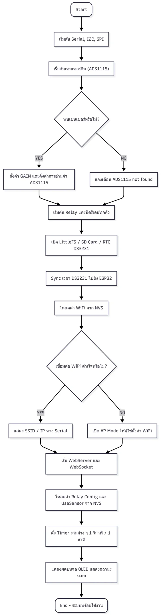 เมื่อเปิดระบบ ESP32 จะทำหน้าที่เป็นศูนย์กลาง คอยอ่านค่าเซนเซอร์